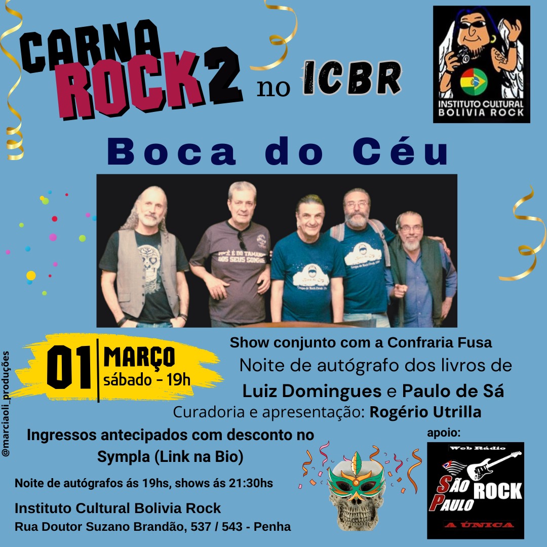 Depois do sucesso do ano passado, o ICBR repete a dose com o Carna Rock 2, trazendo as bandas Boca do Céu e Confraria Fusa para uma noite especial, em que os grupos farão shows em dobradinha e, ainda, dois de seus integrantes aproveitarão a ocasião para lançar seus livros.