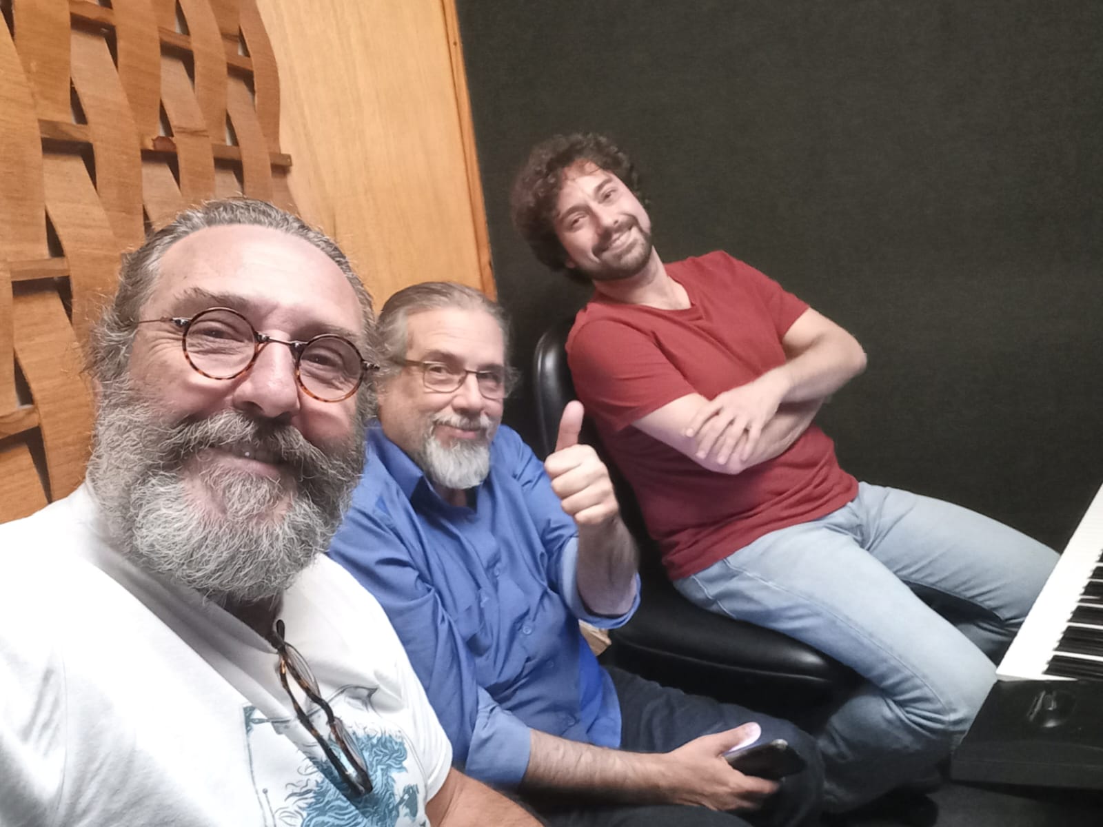 Wilton Rentero no comando da "selfie", eu (Luiz Domingues) e Rodrigo Hid, nosso convidado especial. Boca do Céu a gravar a canção "1969". 3ª sessão de gravação no estúdio Prismathias de São Paulo em 23 de maio de 2023. Click (selfie), acervo e cortesia: Wilton Rentero